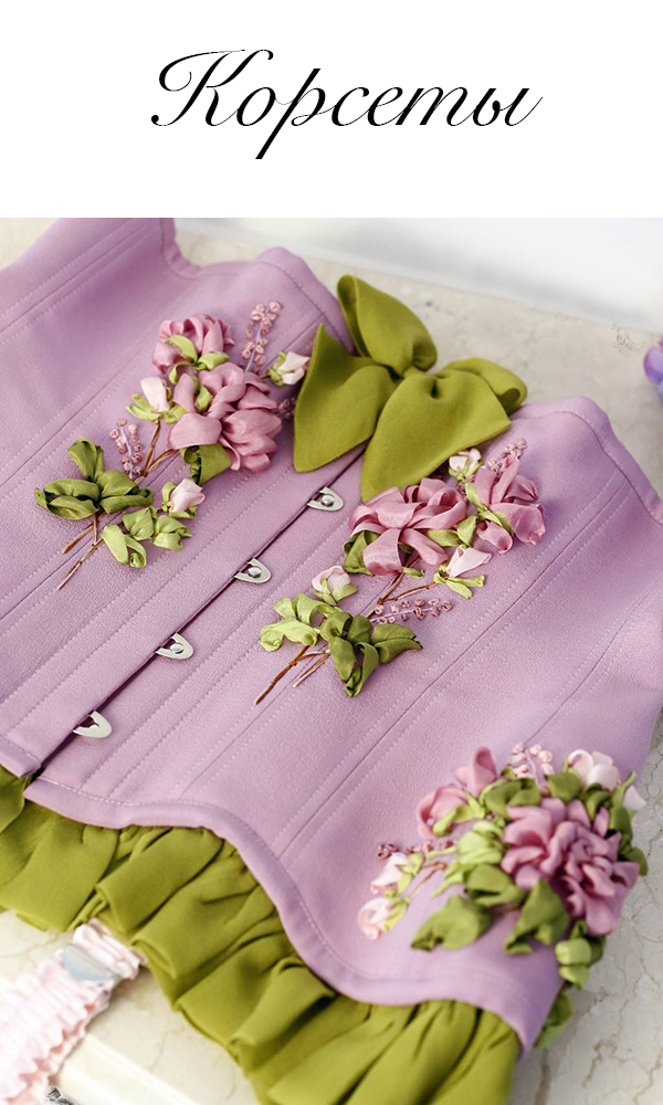 Корсеты, платья, юбки, блузки, жакеты и украшения. В работах - натуральный шелк, самые изысканные кружева и материалы, в том числе антикварные из личной коллекции. Исключительно ручная вышивка и роспись.